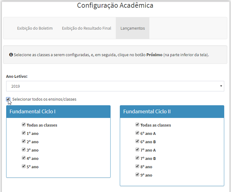 Confira as classes e ensinos selecionados e clique em "Próximo" para prosseguir.