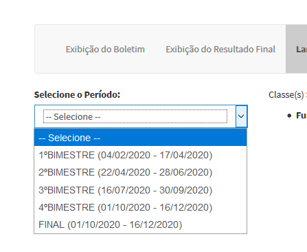3) Selecionar o ano letivo e as classes que serão liberadas o lançamento das notas: