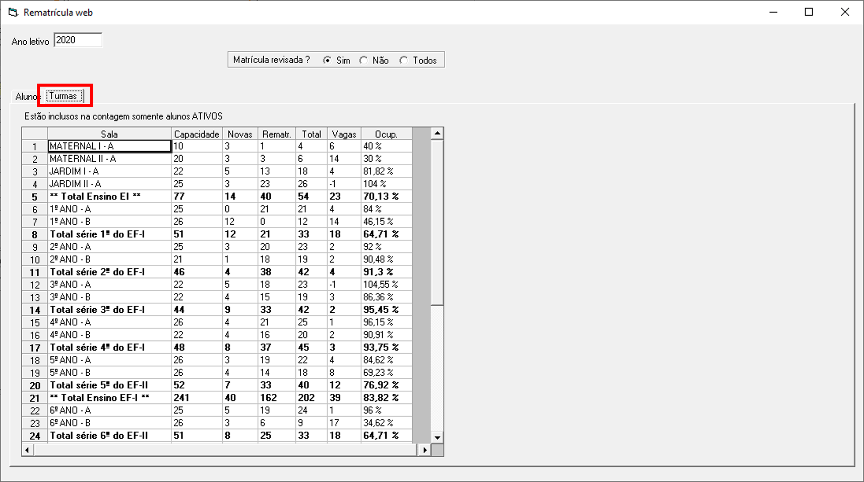 - Aba Turmas (Mostra os totais de matrículas novas, rematrículas e taxa de ocupação)