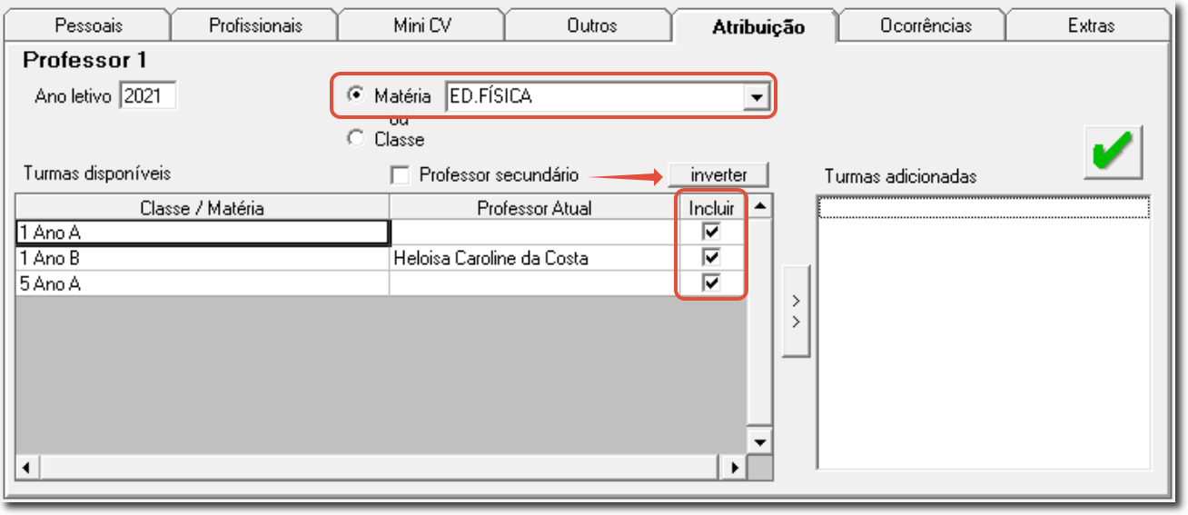 Para estas situações a forma mais fácil de configurar a atribuição de aulas é por matéria, e em seguida utilizar o botão inverter para selecionar todas as turmas de uma vez