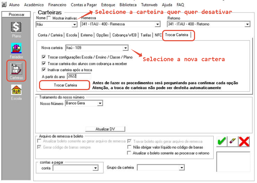 Em algumas situações a escola contrata uma nova carteira bancária e precisa que a carteira bancária atual seja substituida pela nova carteira bancária, pois a carteira atual não será mais utilizada a partir daquele momento.