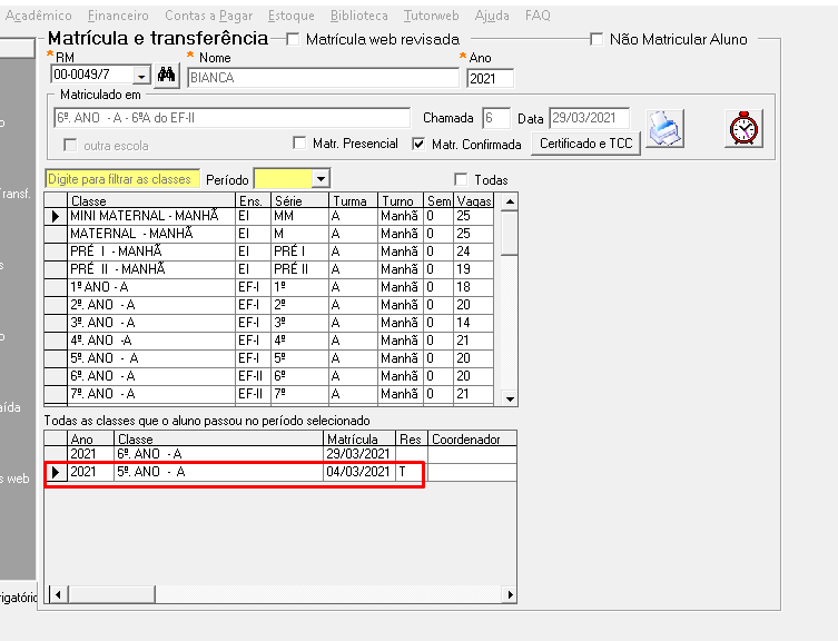 - Selecione a turma para qual o aluno será transferido: