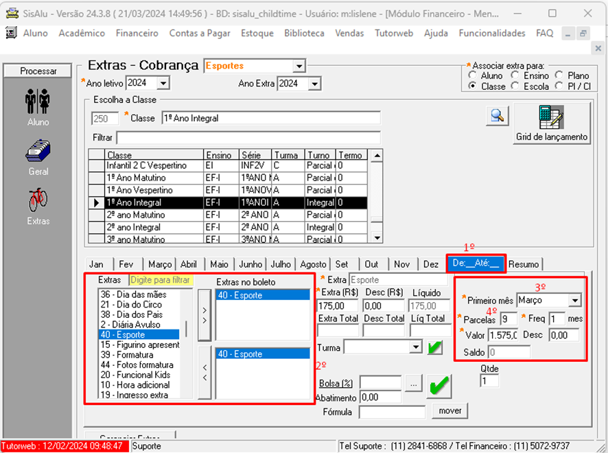 3. Somente é possível selecionar uma turma de cada vez. Se o extra for o mesmo para todas as turmas do ensino ou da escola, no lugar de associar extra para Classe, marcar associar extra para o Ensino ou para Escola.